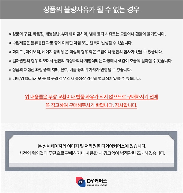 색상이나 사이즈는 컴퓨터/모바일 기기의 해상도, 측정 방법에 따라 차이가 있으며 해당 사유로는 단순 변심으로만 처리 가능합니다.)